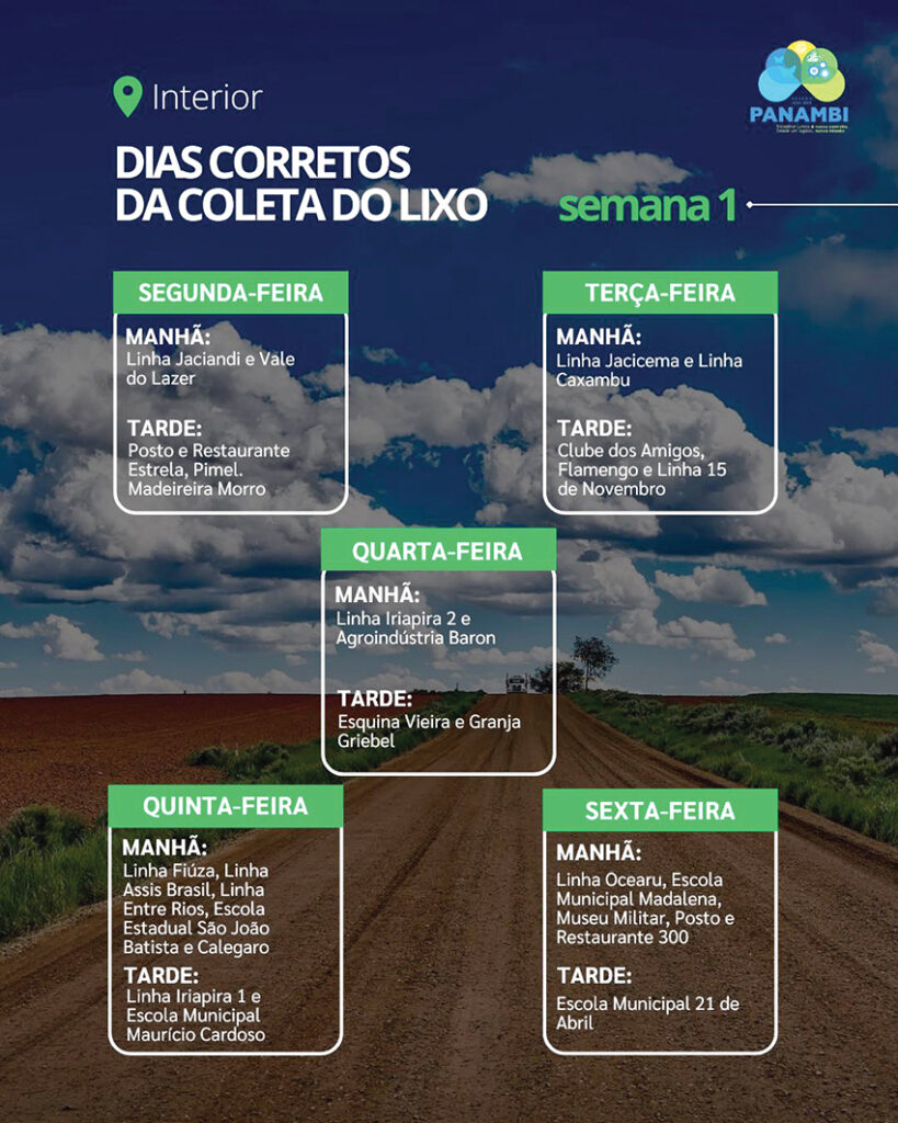 Pensando no cuidado com o meio ambiente, na organização das comunidades e no bom planejamento dos moradores do interior, o Município de Panambi mantém um cronograma estruturado de coleta, dividido em Semana 1 e Semana 2, contemplando as linhas do interior de forma eficiente e responsável.