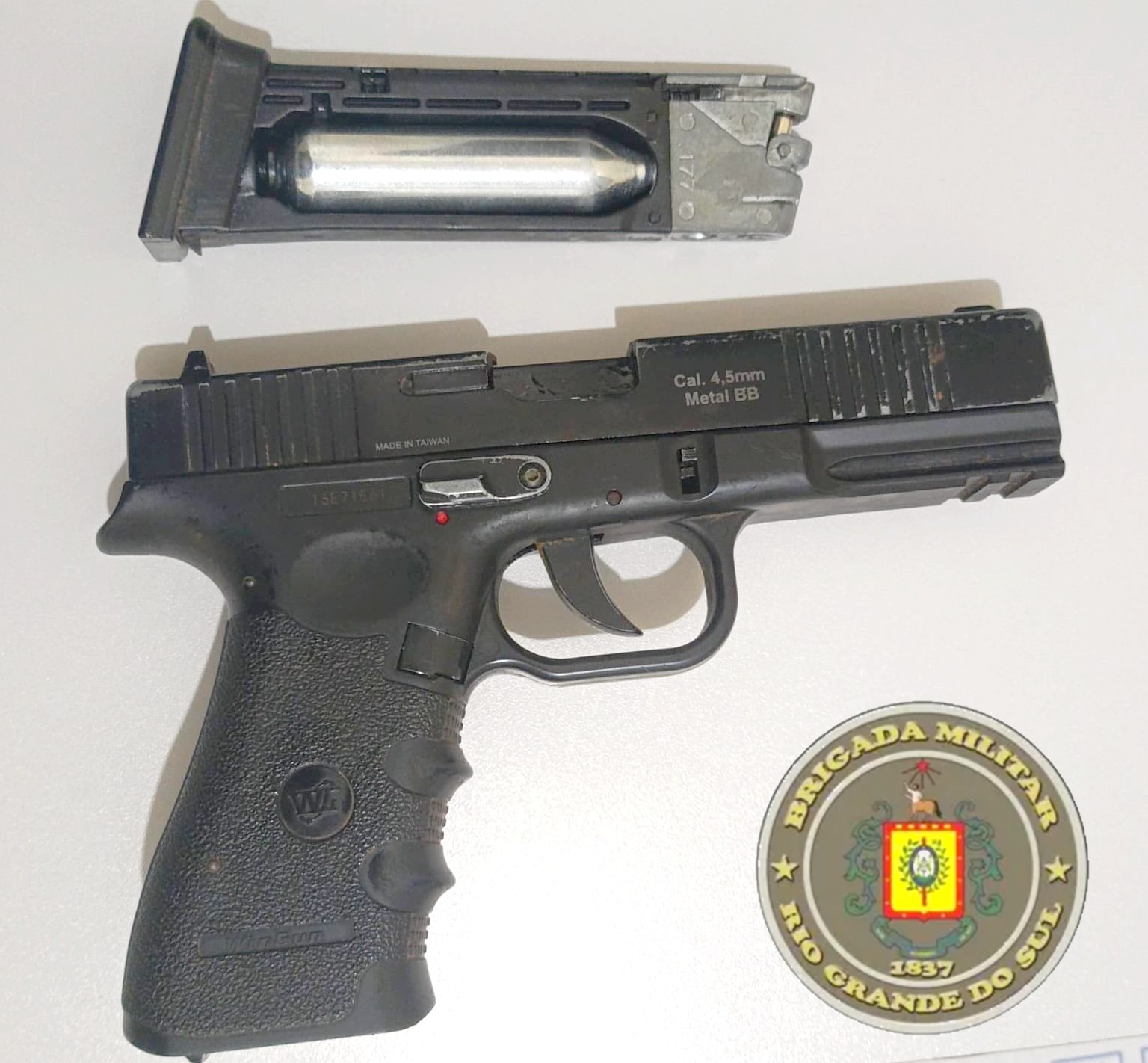 Na madrugada de sábado, por volta das 2h30, uma equipe da Brigada Militar realizava patrulhamento no bairro Kunh, quando abordou um homem na Rua Iriapira. Durante a revista pessoal, foi encontrado um simulacro de pistola na cintura do indivíduo. O simulacro trata-se de uma pistola esportiva “modelo airgun”, réplica perfeita de uma arma de fogo que projeta, a partir de gás comprimido, pequenas esferas metálicas com capacidade de dano corporal reduzido. Diante da situação, o homem foi preso, encaminhado à Unidade de Pronto Atendimento (UPA) para um exame de rotina e, após assinar o termo de compromisso de comparecimento em juízo, acabou sendo liberado. (Adaptação NV).