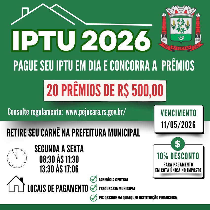 A Administração Municipal de Pejuçara, por meio da Secretaria Municipal da Fazenda, informa que o vencimento do IPTU 2026 ocorre em 11 de maio. Os contribuintes que optarem pelo pagamento em cota única garantem 10% de desconto no valor do imposto e ainda participam do sorteio de 20 prêmios de R$ 500.